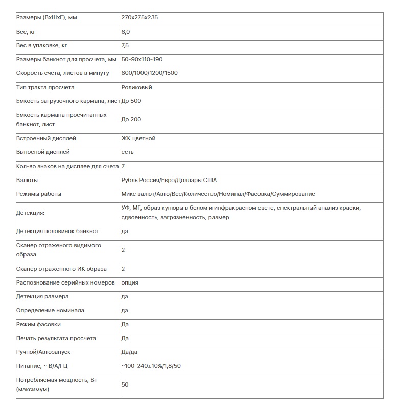 Счетчик прост в уходе и обслуживании: быстрое обновление прошивки, устранение замятий, простая регулировка скорости счета для банкнот различной степени ветхости. Комплексная детекция осуществляется по следующим параметрам: детекция ИК-образа и образа в белом свете, контроль размера банкнот, контроль в УФ-диапазоне, магнитная детекция, контроль ИК-защиты, спектральный анализ краски, контроль оптической плотности.