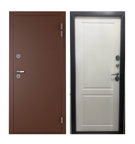 Дверь металлическая Норд серии "Терморазрыв" оптимальное решение для установки в местах, подвергающихся воздействию природных температур. Данная конструкция двери надежно предотвращает промерзание двери при температуре на улице до минус 30 С. Дверь с терморазрывом имеет в районе притвора уникальную 2х камерную конструкцию, состоящую из холодной и теплой зон, которые разграничены между собой двойным слоем уплотнителя, пластиковым элементом в полотне и перфорацией в коробе. Дверь Норд комплектуется двумя сувальдными замками Промет 30.11 и Промет 30.01 четвертого класса взломостойкости, а также алюминиевой дверной ручкой Inspector 93 в цвете хром. Размеры наружные (ВхШхГ) 2104х1089х130 мм, Размеры светового проема (ВхШ) 1913х767 мм, Монтажные размеры короба (ВхШ) 2050х980 мм, Глубина (толщина короба, мм) 130, Толщина полотна 87 мм, 4 контура уплотнения (3 шлегель Q-Ion и 1 Е-образный), Сувальдный замок Промет 30.11, Сувальдный замок Промет 30.01, Ночная задвижка, 3 петли на подшипнике, Наполнение двери - пенополистирол высокой плотности. Применение пенополистирола в качестве внутреннего наполнителя, обеспечивает низкую теплопроводность и высокую звуконепроницаемость. Дверь Норд покрыта износостойкой полимерно-порошковой краской. Цвет внешней стороны двери: антик медный, внутренняя сторона: МДФ Канада.