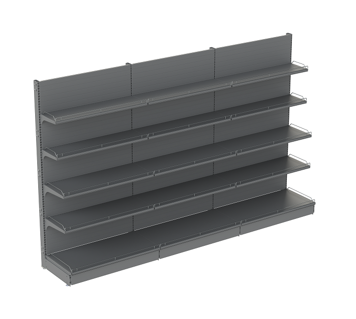 Дополнительные опции: можно увеличить/уменьшить высоту стеллажа (высота: от 1050 мм до 2950 мм), изменить ширину и глубину стеллажа (ширина: 665 мм, 1000 мм, 1250 мм, 1330 мм, глубина: 300 мм, 400 мм, 500 мм, 600 мм), комбинировать стеллаж полками и стенками. Возможно установить стеллаж отдельно стоящим, островным, угловым или собрать в единую линию. А также дополнить пристенный стеллаж навесными элементами, фризами, торцевыми панелями, ценникодержателями, ограничителями и другими элементами стеллажа.